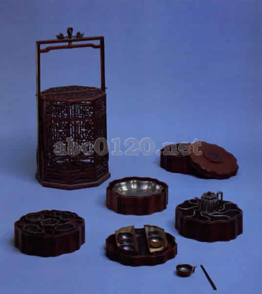 花梨木で作った五段の器の中には、洒注、酒杯、菜入れ、箸など二十七種が入っている。菜入れは銀製で花梨木をくりぬいて外装としており、梅花形、円形、瓢形、葉形の造型は簡素で安定している。花梨木の本日もおもむきを深いものにしている。六個の酒杯も銀製で、外側は瓢箪である。非常に精巧につくられている。梅花形の酒注も工夫をこらした作品で、注口や把手に雷文、腰部に焦葉蝉文といった商や周の時代の青銅器にみえる装飾文様がある。胴部には詩と図案が刻まれている。装飾文、詩、図案はいずれも乾隆帝が特に好んだもので、詩は乾隆帝が巡幸のときこれに従った大臣のひとりが皇帝に献里した作である。