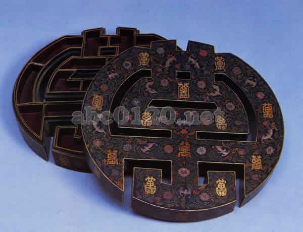 この図案は「万福連綿」の意味をあらわす、めでたい意匠である。盒の中には器形にそって作られた十八個の入子が納められている。何種類もの食品をいれるための器で、皇帝用の食含である。出所:北京「故宮博物院展・紫禁城の宮廷芸術」1985-85