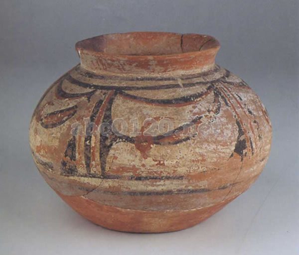泥質紅陶。大口で、丸い胴部、平底。器表面は赤いスリップが施されており、 肩部から胴部にかけて赤いスリップの上に白いスリップが重ねられて塗られている。また四組の対称的な赤、黒色で組み合わされた幾何学図案もある。出所:『中国四川省古代文物展』-三国志のふるさと、遥かなる大地の遺宝2000