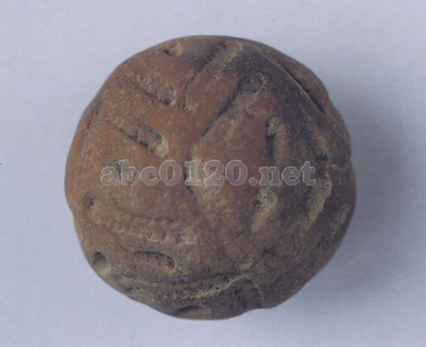 時代:新石器 法量:直径1.7cm 出土年:1959年 出土地点:巫山県大渓遺跡 泥質褐陶。円球状で、中身が詰まる(空洞ではない)。球面には幾何学模様が圧印されている。出所:『中国四川省古代文物展』-三国志のふるさと、遥かなる大地の遺宝2000