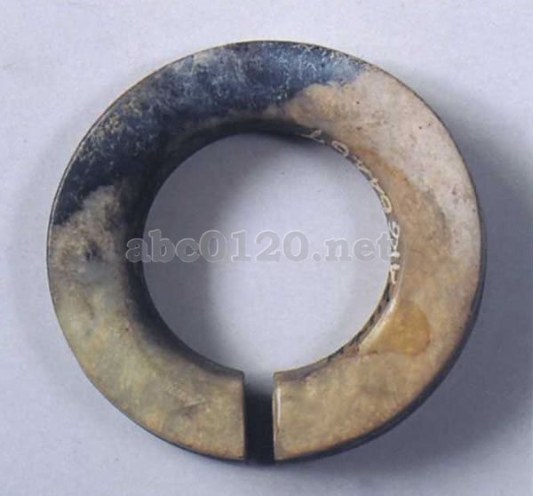 時 代:新石器 法 量:直径4.8cm 出土年:1959年 出土地点:巫山県大渓遺跡M4 玉石製で灰色の帯がみられ、円環状の形態である。出所:『中国四川省古代文物展』-三国志のふるさと、遥かなる大地の遺宝2000