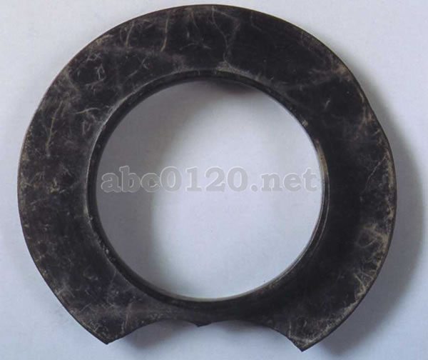 玉製品 時代:商殷 法量:直径11.2cm 出土地点:広漢月亮湾 紫褐色で、自然の縞模様がみられる。玉璧状で、体部は内縁が稜状に突出した円筒状を形成している。玉媛の厚さは均一で、縁が丸い。円筒は大口である。軽て薄く、精細に製作されている。出所:『中国四川省古代文物展』-三国志のふるさと、遥かなる大地の遺宝2000