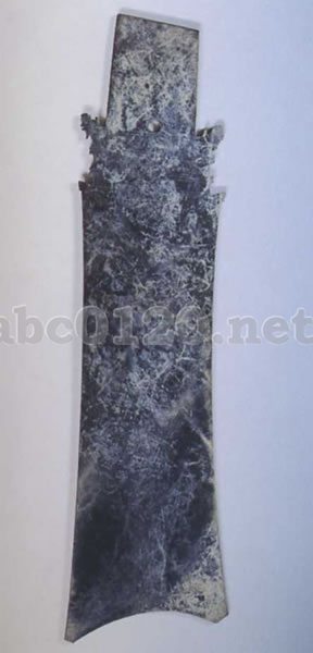 青黒色、器画には白い斑がみられる。長方形。刃部端は凹弧状を呈し、片方の先端が長い。長方形の柄には、刻線紋が多くみられる。柄の両側には牙飾がいくつかみられ、柄の中央には丸い穿孔がある。器体は非常に薄く、柄と器身の厚さは一致している。出所:『中国四川省古代文物展』-三国志のふるさと、遥かなる大地の遺宝2000