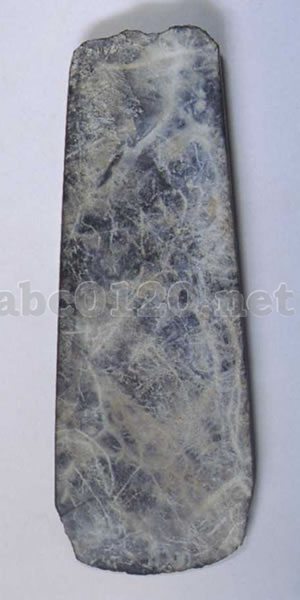 器形は長梯子の形状を呈する。青灰褐色で、全体に白い斑紋がみられる。比較的に厚く、 中央部は両面ともわずかに盛り上がる。端部は丸くつぶれ、磨かれていない。刃部は丸く磨かれ、石(石+奔)の刃部に似る。出所:『中国四川省古代文物展』-三国志のふるさと、遥かなる大地の遺宝2000