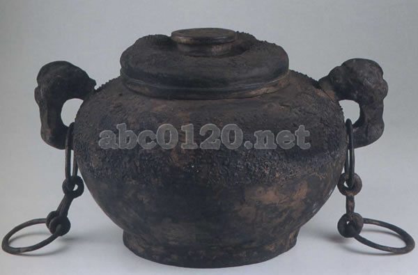 口縁部はまっすぐに立ち上がり、胴都は丸い、肩部は広がる。胴部下位はすぼまり、圏足である。肩部には立体的な羊の首の形をした把手が置かれている。胴部下位には獣の鼻が付けられている。高坏を被せた形の蓋をもつ.蓋とを器身には連携する4本の板状の稜がある。蓋の板状稜の問には円渦紋が施されており、肩部には6個の円渦紋が廻らされている。この罍の蓋と肩部に施されている装飾は殷代に流行した円渦紋である。造形は重厚、紋飾は古風、形態も紋飾も殷末から周代初期の同類の器物に類似している。出所:『中国四川省古代文物展』-三国志のふるさと、遥かなる大地の遺宝2000