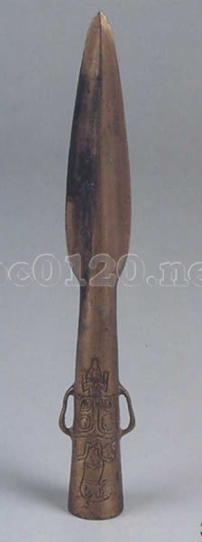 前方部が膨らみ鋒を作りだしている。円筩はまっすぐになの先頭部に達する。凸脊で、長骹で二つの耳をもち、耳の間に牛鼠紋が施されている。銎の近くに雲紋が一周めぐる。同時に出土したものは五点で、その中の四点は紋飾が類似している。出所:『中国四川省古代文物展』-三国志のふるさと、遥かなる大地の遺宝2000