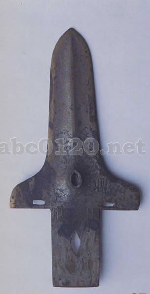 援は脊を持ち、後部は幅広い。援部には虎斑紋、「部族」を示す符号が鋳造されている。欄には二つ穿孔がある。援と内にはオリープ形の穿孔をもつ。出所:『中国四川省古代文物展』-三国志のふるさと、遥かなる大地の遺宝2000