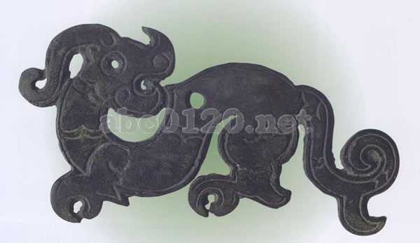 龍の身体は「S」形に曲がりくねり、振り向きながら奔走している状況を表している。造形は優美で誇張を含む。長く巻いた角、長く巻いた尾、口を広げ、爪は尖っている。片面は能の体の輪郭と筋肉図紋が陰刻されており、 もう一方の片面は素面である。背の部分には一つの丸い穿孔がある。出所:『中国四川省古代文物展』-三国志のふるさと、遥かなる大地の遺宝2000