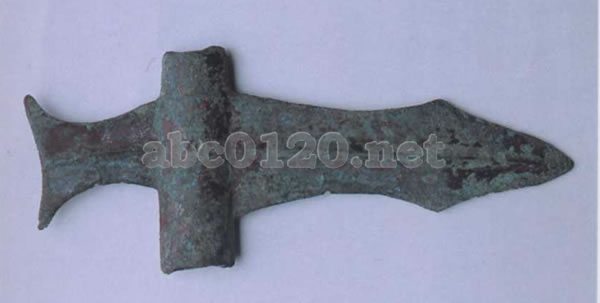 銅戈は魚尾形を呈し、中部で脊が出ている。周囲に刃部をもち、援身はくびれる。前方が三角形を呈している。胡も欄もなく、中空の楕円形の柱がこれに代わる役割を担う。柱身の中部には一つの丸い穿孔がある。出所:『中国四川省古代文物展』-三国志のふるさと、遥かなる大地の遺宝2000