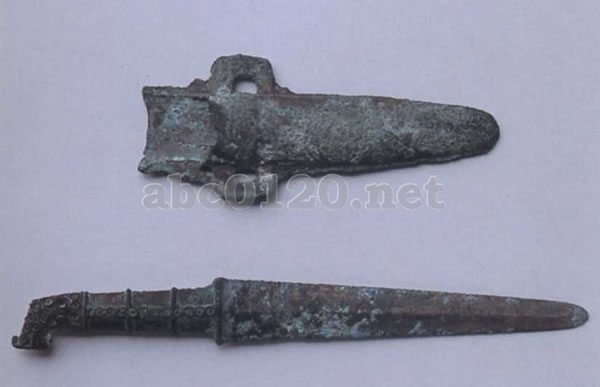 剣身は長細く、中部には脊が出る。竹節状の楕円柱形に龍首の柄をもつ。中空である。柄の身部は両面とも中央に縦一列の同心円圏紋が施されており、節には索紋が施されている。剣鞘はやや丸みを帯びるが平らなもので、刃先中部までを覆い、短小である。両翼には半環川形の耳をもつ。素面である。出土した時は剣身が赤色の絹織物で覆われていたことが確認されている。出所:『中国四川省古代文物展』-三国志のふるさと、遥かなる大地の遺宝2000