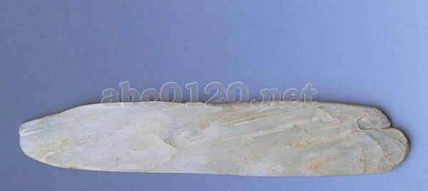 時代:戦国 法量:長さ21cm、幅4.3cm、厚さ1.5cm 出土年:1992年 出土地点:茂県牟托 ほぼ圭形、白色を呈する。全体に繊縦状の筋目がある。柄の端には人為的に叩かれた痕跡がみられる。両瑞に丸い刃部をもつ。出所:『中国四川省古代文物展』-三国志のふるさと、遥かなる大地の遺宝2000