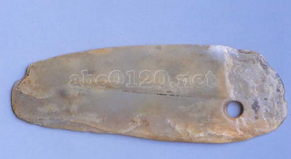 時代:戦国 法量:長さ7.8cm、幅2.9cm、厚さ0.5cm 出土年:1992年 出土地点:茂県牟托 黄玉で製作された舌形玉刀で、器身部の中央に一本の溝が彫り込まれている。溝の上端には一つ丸い穿孔がある。出所:『中国四川省古代文物展』-三国志のふるさと、遥かなる大地の遺宝2000