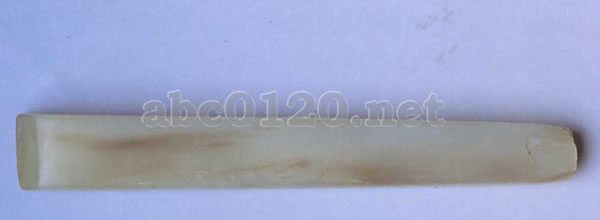 時代:戦国 法量:長さ7.8cm、幅1.1cm 出土年:1992年 出土地点:茂県牟托 精美な技法は細部にわたり、玉質もたいへん良い。全体に磨かれている。片端に斜めの刃部がみられ、柄端は楕円状に磨かれている。断面は長方形を呈している。出所:『中国四川省古代文物展』-三国志のふるさと、遥かなる大地の遺宝2000