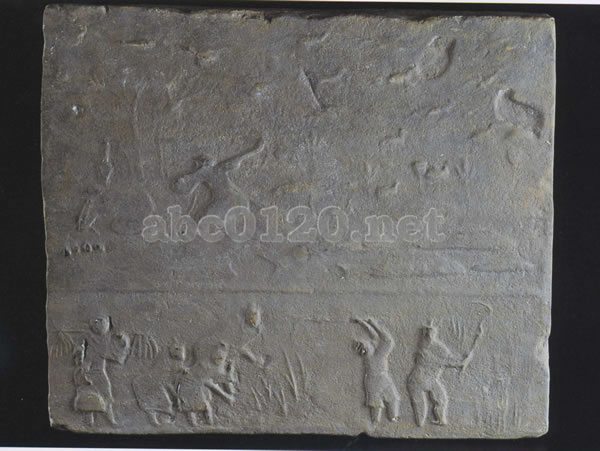 画像は上下ニつの部分に分けられる。 上部右辺は蓮池である。蓮花が伸び咲き、蓮葉が水面に浮く。水面下には大魚が数匹みられ、水面には野鴨が泳いでいる。蓮池の上空には鳥の一群が東西両方向へと力強く飛んでいる。左端の木の影には二人の「弋人」がまさに弓を張って射ろうとしている。下部は収穫図で、三人が身をかがめながら穂を収穫しており、二人は鎌(鏺鎌鋸)で草を刈る。もう一人は籠をさげている。収穫の全ての行程を表現しているのである。この磚の内容は姓宙豊富で、人物は生動感にあふれる。平穂な自然田園風景を醸し出している。出所:『中国四川省古代文物展』-三国志のふるさと、遥かなる大地の遺宝2000
