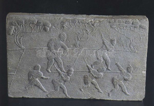 画面は線を用いて田畑が整然と数枚に分けられ、縦横幾重にも広がっていることを示している。縁には三本の樹があり、田1には4人が両手で鎌を握り、後ろに高々と挙げている。その後ろには二人が鉢を持ち、種を播いている。これは農民が亡しいながらも楽しく労働している場面である。この画像磚の人物の動作は整然としており、躍動感がみられる。これは漢代の農業神への祭祀のための舞踊だという研究者もいる。出所:『中国四川省古代文物展』-三国志のふるさと、遥かなる大地の遺宝2000