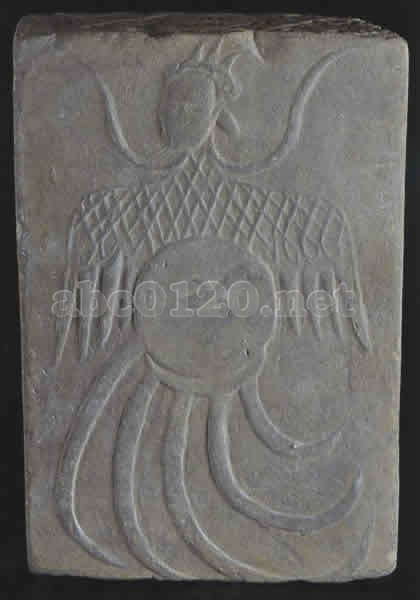 画像磚の羽人は頭が人で身体が鳥である。頭髪は髷を結っている。腹部には丸い輪が描かれており、その愉輪中には月桂樹とヒキガエルが描かれている。月桂樹とヒキガエルは月神の象徴である。これは古典史料の「嫦娥は月に逃げ、月に身をよせて蟾蜍(吉祥の象徴とされるヒキガエル)になり、月の精となった」という記載と符号するものである。画像磚の中の羽人の羽毛は明晰で、羽を広げて飛翔している様子が1描かれている。出所:『中国四川省古代文物展』-三国志のふるさと、遥かなる大地の遺宝2000