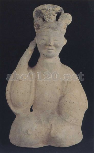 泥質紅陶.型取り模型。髪型は高く髪を結い、花簪をする。襟を交わし、広い袖、長衣の着物を身にまとい、腰に幅広の帯をしめる。ひざまずきながら、左手は自然に膝の上に置き、右手は上に挙げて、顔をわずかに上げる。優美な楽曲の中に耽溺している様を彷佛とさせる。出所:『中国四川省古代文物展』-三国志のふるさと、遥かなる大地の遺宝2000