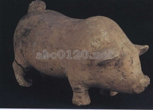 泥質褐陶。左右対称の型取り模型である。形態は肥えて丸い。口元は粗く丸く、短かめに作られ、耳は斜めに立ち上がり、肩は高く盛り上がる。背中はなめらかに丸い。臀部は肥人し、尾は上を向いて丸まる。四本の足は短く力感がある。長年にわたって生育された良種の豚の模型であることが明ららかである。出所:『中国四川省古代文物展』-三国志のふるさと、遥かなる大地の遺宝2000