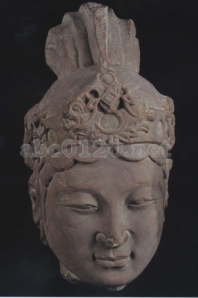 菩薩の髪型は高髷で、額の髪型は六枚の蓮弁形を呈している。宝冠を載せている。宝冠は多くの花で飾られ、宝冠の中部や両側の花の間には菱形や円形の宝飾品がみられる。苦薩の顔だちは豊満・丸顔で、鼻はまっすぐに伸び、清らかな目は正面を見据えている。唇は丸い花弁形を呈して、端は内におさまっており、ひとびとに平和慈愛の感覚を与えている。宝冠を除くと、生き生きとした東方の淑女の完全なる形状といえよう。出所:『中国四川省古代文物展』-三国志のふるさと、遥かなる大地の遺宝2000