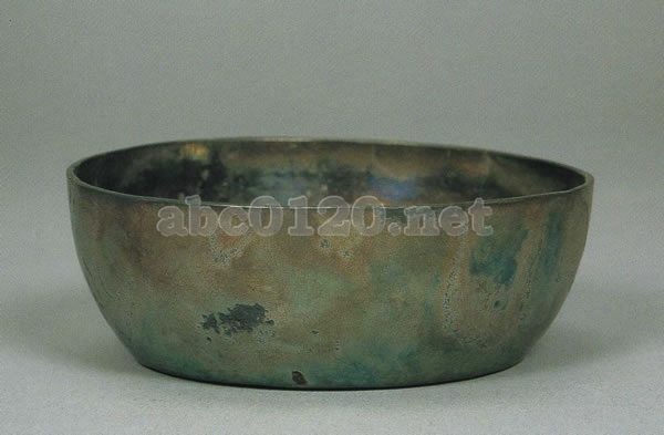 北宋 10世紀 直径10.2cm 直縁式、平底で、いっさい装飾のない銀製の素文洗である。洗とは小型の「たらい」形の器をさす。打ち出し成形しただけの、たいへん簡素な作りである。銀色はかなりよく残っているが、器の内側は黒化がすすんでいる。現状では口縁に数力所ひびが入っている。出所:『地下宮殿の遺宝中国河北省定州北宋塔基出土文物展』
