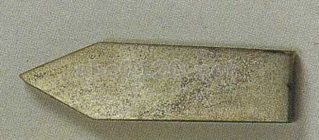 戦国―前漢 前5-後1世紀 4.7×1.4cm これも戦国~前漢時代の作の玉器である。圭は先瑞が三角形に尖った板状の玉器である。この白玉の圭は通有の圭から比べると小さなものである。素文。出所:『地下宮殿の遺宝中国河北省定州北宋塔基出土文物展』
