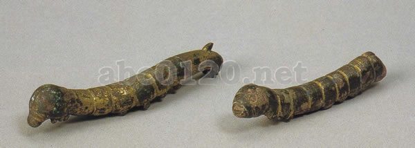 「かいこ」形の鎮。金蚕・銀蚕・銅蚕などがあり、漢代に主につくられている。この蚕は銅製鍍金の鎮である。大・小あり、いずれも鍍金が施されているが、小さい蚕の方は部分的に鍍金が剥落している。大きい蚕は体が屈曲しており、体は6節となり、小さな突起のような足が10本あらわされている。この二つの金蚕も漢代の墳墓に副葬されていたものが堀りおこされ、塔基に埋納されたものである。出所:『地下宮殿の遺宝中国河北省定州北宋塔基出土文物展』