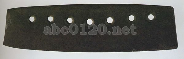生産用具。花崗岩質。両面磨製の,扁平な長方形。背部は平らで,柄を取り付けるため七つの孔がある。刈り取りや,切断用に使われたのであろう。北陰陽営出土の各種石製農耕用具は合計628点にのぼる。出所:『南京博物院展』1981
