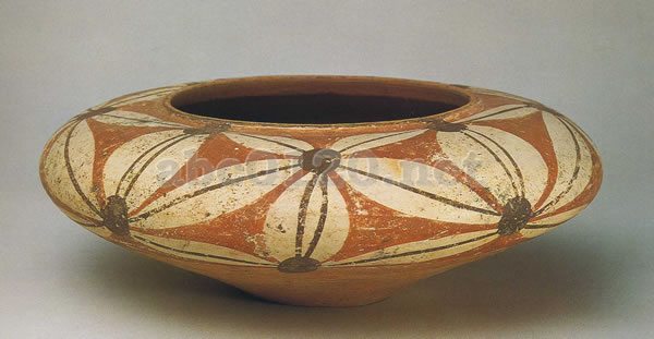 淮北平原の新石器時代の彩陶 紀元前約3000年 1976年邳県大墩子出土 高さ9.4cm 口径14.Ocm 食器。粘土質紅陶。白色の化粧掛けがなされた肩腹部には紅褐色の弧線と円点によって,花柄が構成されている。出所:『南京博物院展』1981