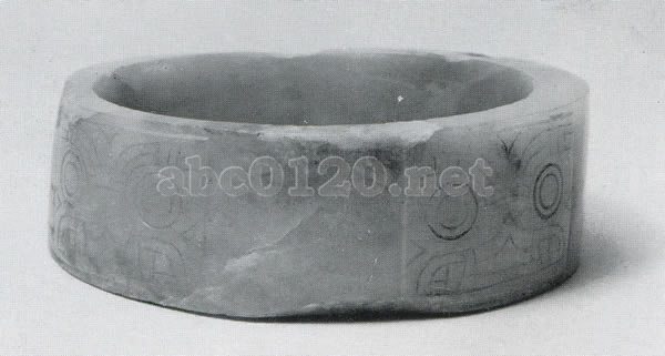 太湖地区の新石器時代陶器と玉彫 紀元前約2,500~2,000年 1977年呉県張陵山出土 高さ3.4cm 孔径8.2cm 祭祀に使う玉器。礼器。陽起石製。短い円筒形。外面に磨き出された長方形の凸面四面には,それぞれ獣面文様が浅刻されている。精細な線刻による,簡潔な文様である。出所:『南京博物院展』1981
