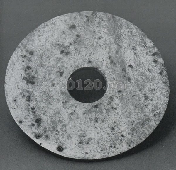 祭祀に使う玉器。透閃石製。偏平な円形で中央に円孔が有り,表面は滑らかで文様は無い。『周礼』に「蒼壁を以て天に礼す」とあることから,璧が古代の天を祭るための礼器であったことが分かる。出所:『南京博物院展』1981