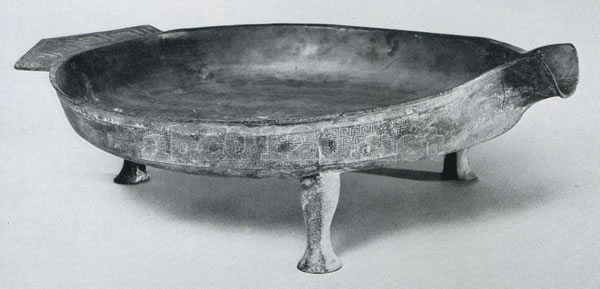 容器。動物をかたどった造形がなされ,頭が流(注口),尾が柄になっている。三足が有り,盤身を雷文で飾る。出所:『南京博物院展』1981