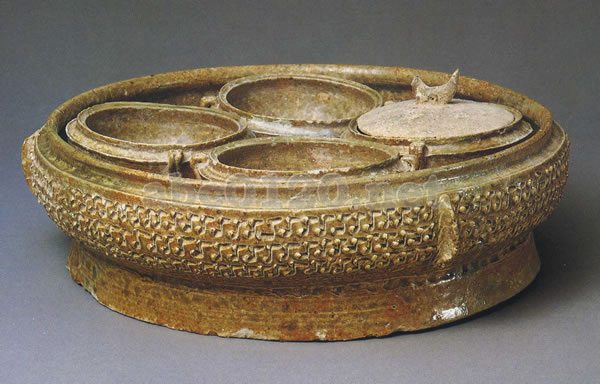 食物を盛る器。浅い腹,圏台をもつ。器内には四つの小型盂(鉢)が納められ,盂には蓋がある。器腹には突出した稜と刺突文があり, これも武進県奄城出土の青銅器の文様に近い。出所:『南京博物院展』1981