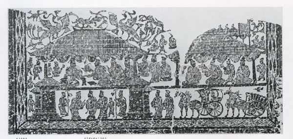 画像石墓は後漢代に盛んであった。江蘇省内の画像石墓は,徐州地区の発見が比較的多い。画像石の内容は,写実を主としていて,すでに中国画の芸術的特質を備えた古代絵画の優品といえる。これは重楼高閣図で,上層には宴席の様子が,下層には双門刻まれていて, 門内は迎賓の場面で。その側には軺(小)車と大車が停まっている。出所:『南京博物院展』1981