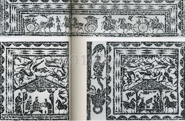 拓本は三点に分かれ,一つは草馬出行図,他の二幅は宴席図である。注目すべきは,閣の外側に彫り出された半連珠文と菱形文がすでに図案化されていること,また,家屋上方の空間が飛鳥流雲で満たされていることである。これも漢代画像石刻の構図の特長の一つである。出所:『南京博物院展』1981