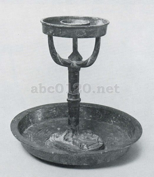 漢代の画像石と工芸品 紀元前206~西暦220年 1970年徐州市土山出土 高さ26.5cm 雁足形の灯火器。底盤の縁に「楽来」の二字が刻まれている。出所:『南京博物院展』1981