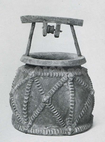 滑車のついた井戸。副葬用の明器。粘土質紅陶。井戸の上につるべの受け木と滑車がある。井戸の周囲には粗縄文様が貼りつけられている。出所:『南京博物院展』1981