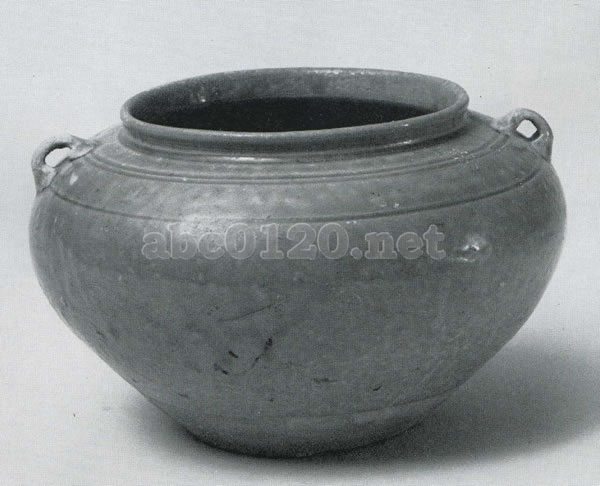 二つの把手のある青磁壼。灰白色地に内外ともに灰青色の釉が均―にかかる。肩に双系(耳)が有り,紐を通すことができる。西晋太康6年(西暦285年)の鉛製買地券と同時出土。出所:『南京博物院展』1981