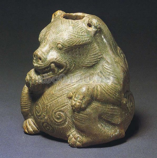 西晋代の青磁器 西暦265~316年 1965年江寧県秣陵出土 高さ8.5cm 灰色地に青黄色の釉を施す。坐して食するおどけた熊の形をかたどったもの。頂部の円孔は注水口であろう。出所:『南京博物院展』1981