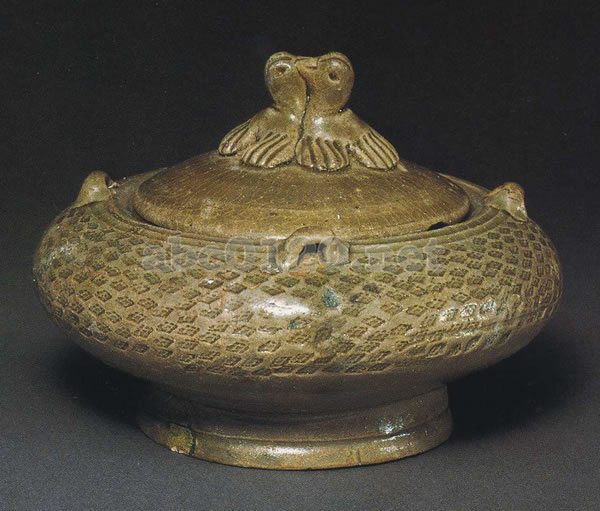 灰白色地に淡い青色釉を施す。器腹には斜力格文が押印され, 口縁部には系,底には低い圏台が有る。蓋には向かい合う仲むつまじい双鳥の紐が付いている。実用性と芸術性を兼ね備えた佳品である。出所:『南京博物院展』1981