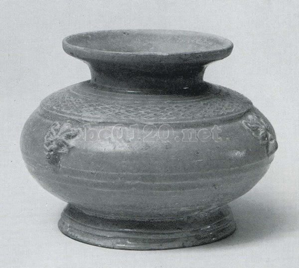 灰白色地に青色釉を施す。浅い盤状の口,短い頸,鼓腹と圏台をもつ。肩には斜方格文が押印され、腹部には型押しの鋪首(獣頭形鐶座)が貼りつけられている。出所:『南京博物院展』1981