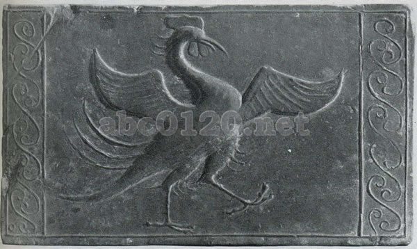 東晋・南朝の磚画,陶塑,青磁器 西暦317~589至年 1972年鎮江市畜牧場出土 長さ31.5cm 幅18.Ocm 厚さ4.5cm 墓室用磚。「朱雀」は南の方位を象徴する神獣。出所:『南京博物院展』1981