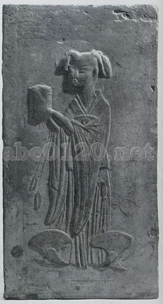 墓室用磚。身を横にし,右手に奩を捧げ持つ。出土時,墓室西壁に嵌め込まれていた。出所:『南京博物院展』1981
