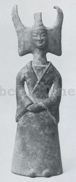 東晋・南朝の磚画,陶塑,青磁器 西暦317~589至年 1960年前京市西善橋出土 高さ37.5cm 副葬用の明器。、右袵寛袖の長衣を着る。顔の作りが美しい。頭を高髻(まげ)に結う。「竹林七賢と栄啓期」型押し磚画墓の墓室前部からの出土。出所:『南京博物院展』1981