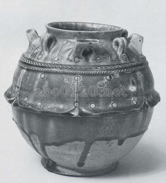 灰白色地に青色釉を施す。肩部には四つの橋形の系(みみ)が付き,腹部には下端がわずかに反りかえった覆蓮弁が浮き彫りされている。蓮弁文様の出現は当時の仏教隆盛と関係がある。出所:『南京博物院展』1981