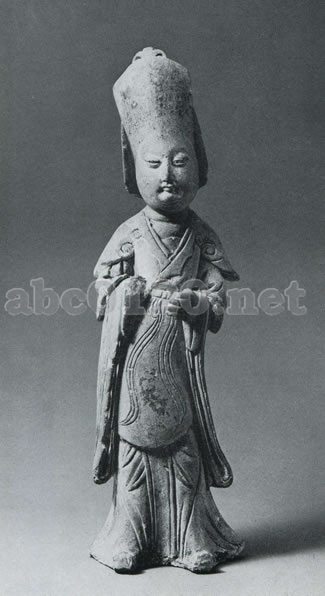 ろに蓮の葉状の飾りをつけた袂が見える。長裙(はかま)をはき,肩掛けをし,腰覆いをまいている。脚部には尖って上にそった靴のさきがのぞく。服装からして,一般の女性ではなく皇宮の女官であろう。出所:『南京博物院展』1981