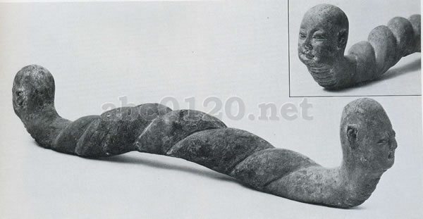 欽陵後室出土。蛇身をからませ両端に二つの人頭をもつ俑。人頭蛇身の神も『山海経』によく見られ,漢代画像石にも同様の題材が取り上げられている。一般に,からみあう双人頭蛇身像は伏羲と女媧(両者とも中国伝説上の人物)の象徴である。出所:『南京博物院展』1981