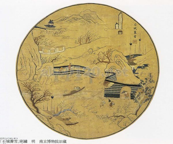 明代の南京城とその遺物 西暦1368~1644年 南京博物院旧蔵 縦横各48.5cm。金陵八景」を題材とする刺繍。明代晩期の作品。出所:『南京博物院展』1981