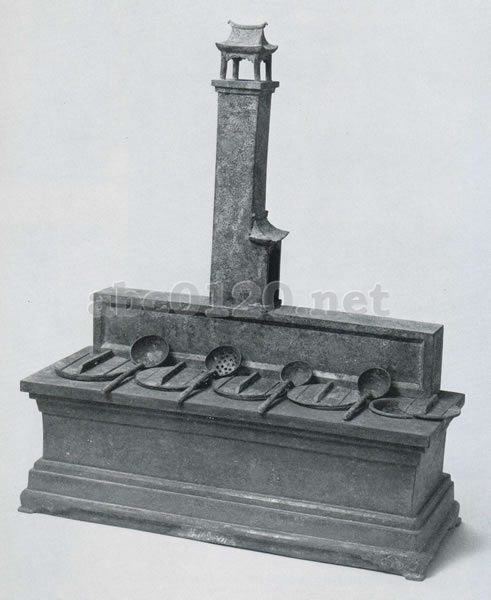 青銅のかまど。副葬用の明器。灶台は長方形の須彌座状を成す。台には大小五つの蓋付き鍋、四つの銅勺が載る。灶台後面に五つの焚き口があり,それぞれ高い煙突へ通じている。煙突の頂部には方亭があしらわれている。明代の生活用具を忠実に模したミニチュアである。出所:『南京博物院展』1981