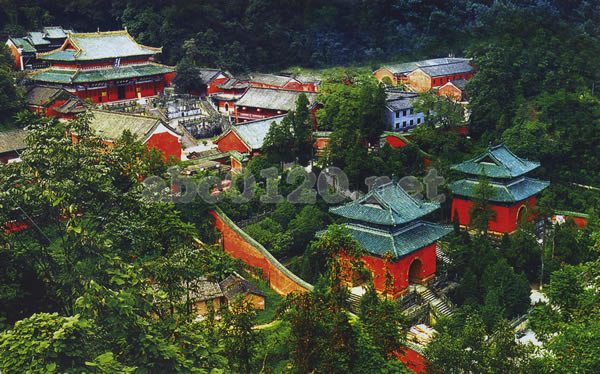 武当山の古代建築物群は唐の貞観(627年-649年)の頃に築造を始めたもので、明の永楽21年(1423年)に完工し、「九宮九観」(宮殿が9カ所、道観が9力所)、36の尼寺、72の岩窟廟のある道教の建築物群が形成されている。武当山の古代建築物群は全体としての構想が級密で、軽重がはっきりしており、配置も合理的である。既存の建築物の規模の大きさ、 レベルの高さ、神仏の像、供え物およびその器具の種類の多さは中国に現存する道教の建築物群の中でも全く目にすることはない。