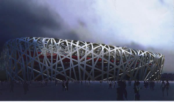 国家スタジアムはスイスのジャック・ヘルツォーク・ビエールドーロン建築設計事務所、オヤナ工事顧問会社および中国建築設計研究院からなる設計連合体が設計した「鳥の巣」案を採用した。同案の主体設計には一連の放射状の鉄鋼製ネットがお碗の形をしたスタンド区をめぐって回転するようになり、スペースの構造は科学的で簡潔で、建物と構造が完全に統一され、デザインにも新鮮感があり、ユニークな構造で、全国の象徴的なスポーッ・レジャー施設となるものである。国家スタジアムは市民がスポーツ活動に参加し、スポーッやレジャーを楽しむ大型公共施設となるばかりでなく、そのユニークな現代建築の風格から、北京の将来のいま一つの観光スポットとなるだろう。国家スタジアムは2003年12月24日に着工、2006年に完成し、テスト使用を始める予定。出所:『ようこそ北京五輪(オリンピック)2008』